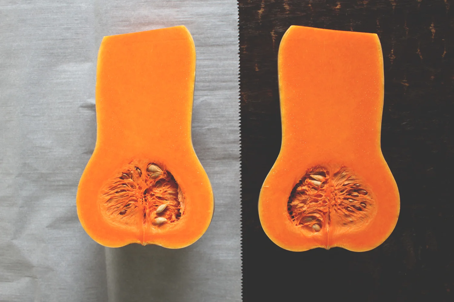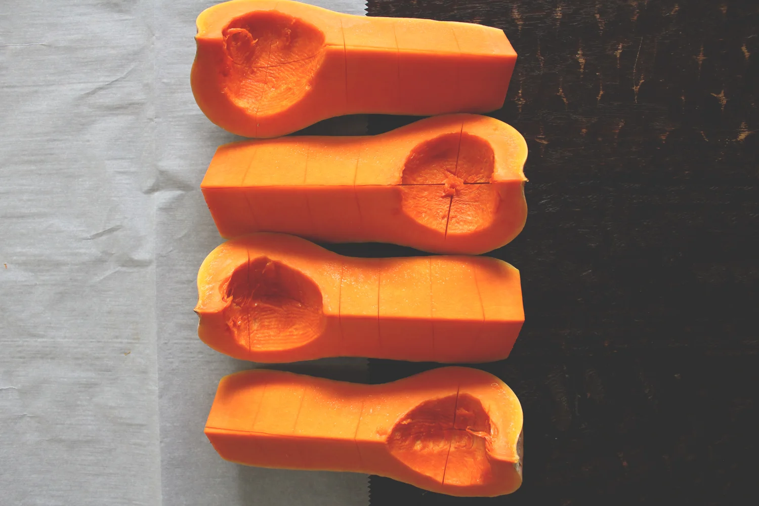 - Then you'll want to get your butternut squash and cut it like the photo above and like so many other butternut squash recipes found on this blog.